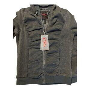 Dark gray jacket with a hood. Features a zip-up front. Perfect for everyday wear.