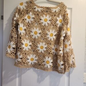 Chic crochet blouse with floral design by Cato. Tan and white colors. Perfect for casual wear. Size large excellent pre-owned condition. Smoke free home.