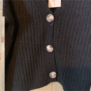 Top / cardigan is v-neck with button closure. Could be worn open or closed