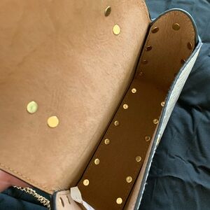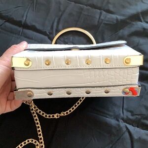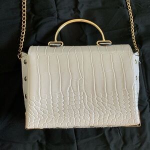 Small white leather reptile print purse with gold accents. The purse measures 8 1/4” wide by 5 1/2” high by 2 1/2” deep. The gold chain shoulder strap measures 23”. Has a magnetic snap closure on front. Gold rivets hold the purse together. This is a very unique little purse by an unknown brand or maker.