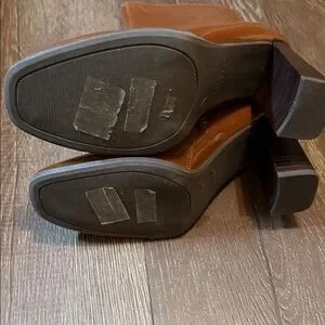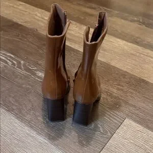 Chic tan heeled boots with a sleek design. Perfect for elevating any outfit.