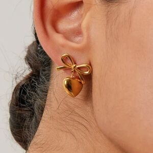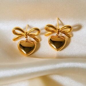 Elegant gold heart earrings with a charming bow design. Perfect for adding a touch of sophistication to any outfit. Add a touch of charm with these Elegant Heart Bow Earrings. Their delicate heart shape paired with a playful bow design brings a sweet, flirty vibe to any outfit. Perfect for brightening your day or gifting a loved one a subtle symbol of affection.