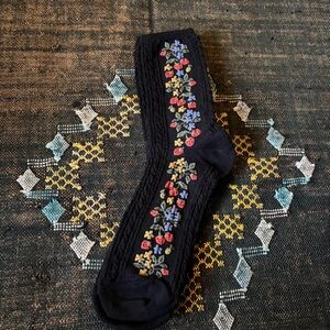 Tiepology socks, made in Korea. Cotton Blend. So cute & amazingly sturdy. You will get compliments. In black with Strawberry vines & blossoms. They will add to every single outfit.