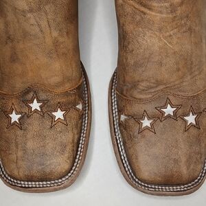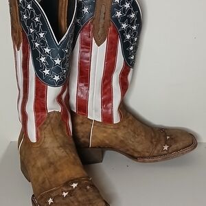 Bold statement cowboy boots featuring American flag shafts with star detailing and a brown leather foot. Square toe western style. Marked size men’s 12D. Made in Mexico.