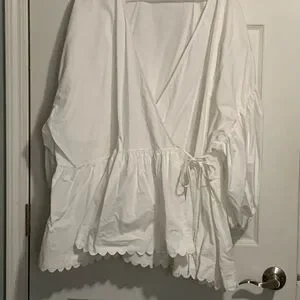 Chic wrap blouse with tie detail. Scalloped hem adds elegance. Perfect for versatile styling.