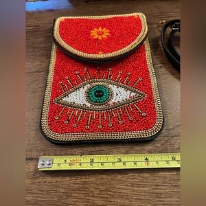 Stylish and vibrant red crossbody bag with intricate beading. Perfect for adding a pop of color to any outfit.