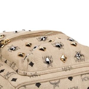 Stylish MCM backpack adorned with gold and silver studs. Perfect for adding flair to any outfit. Durable and fashionable.