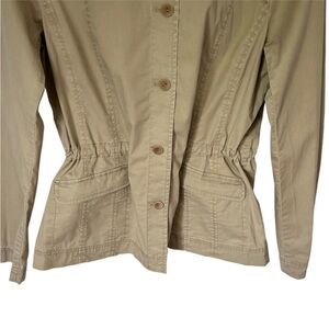 Keywords: Eileen Fisher, utility jacket, tan jacket, button front, collared jacket, long sleeve jacket, cotton blend, women's outerwear, casual jacket, smart casual, layering piece, minimalist, classic style, military, truckers jacket