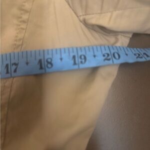 Lightweight khaki utility jacket with inner cinch waist that can be tightened or loosened for an expert fit. Ruffled stand up collar. Two front patch pockets.