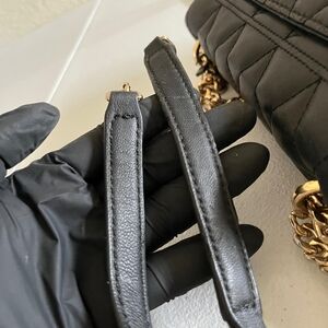 Exterior is neatly used, scuffs in the leather, chain and clasp shows fades, scratches and peels on leather and strap, minimal roughness on corner edges.