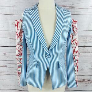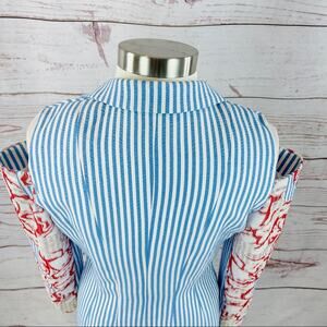 Alberto Makali open shoulder seersucker stripe blue and white blazer with coral/red accents on the arms. Fully lined with single-button closure. Pockets, long sleeves. LIKE NEW! Size Medium