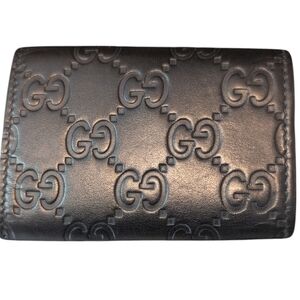 Elegant black leather key wallet with embossed Gucci logo. There are a few key rings missing. Please enlarge pictures. Preloved. There is some wear. Thanks for looking and have a great day.