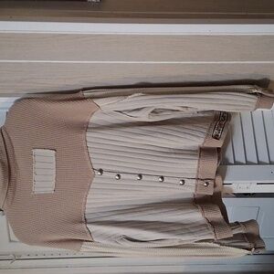 Elegant knit cardigan with a textured pattern. Features a soft beige and cream color scheme.