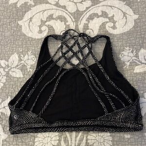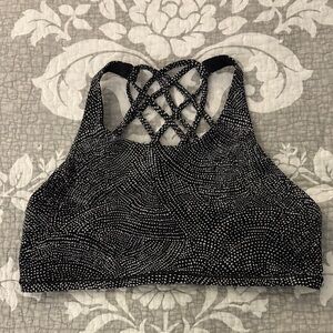 Stylish Lululemon sports bra with intricate strappy back design. Black and white dotted pattern. Peloton Collab. Size 10. NO PADS.