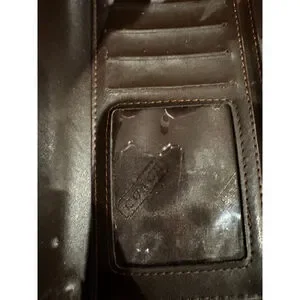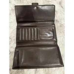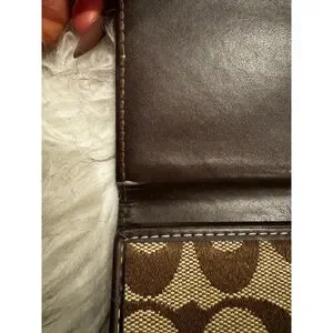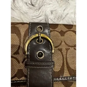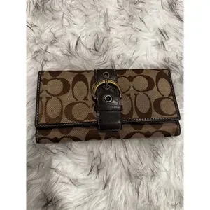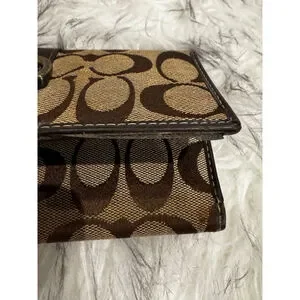 Authentic Coach signature canvas wallet in classic brown and beige with rich dark brown leather trim. Features a secure buckle snap closure and brass-tone hardware. Leather interior is embossed with the Coach logo and offers multiple card slots plus a clear ID window. Pre-owned with light, honest wear—minor canvas discoloration along the bottom edge and slight interior creasing consistent with normal use. Clean, functional, and ready to use.