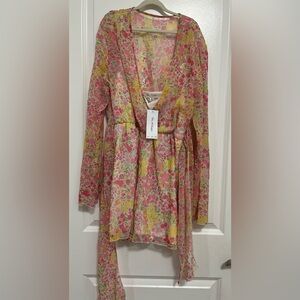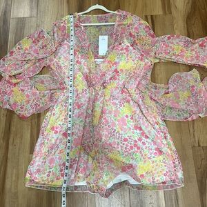 This is a one-piece short jumpsuit (romper) designed to look like a dress. Features a lightweight sheer chiffon overlay with a soft inner lining for comfort and coverage. Beautiful pink, yellow, and green floral print with a flattering V-neckline, long sleeves, and an elastic waist that enhances the silhouette.