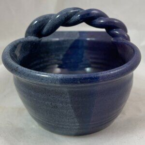 This signed 1996 basket showcases her signature twisted handle and rich glaze work in deep blue and purple tones.