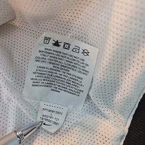 Nike Sportswear Windrunner hooded jacket in lavender purple nylon with white panels and blue accents, tagged L, RN58323, mesh lining, adjustable hood and cuffs, excellent condition, one small mark on lower interior as shown, model is 6' 190lbs. made in Vietnam.
