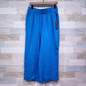 TAHARI Linen Wide Leg Crop Pants Blue Pull On Elastic Waist Casual Womens Medium