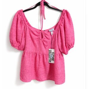 214 Pink Textured Puff Sleeve Babydoll Top Tie Front, Open Back, Feminine Blouse
