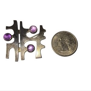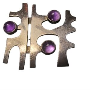 Modernist sterling silver brooch featuring an abstract, geometric design. The brooch features three bezel-set amethyst cabochons, all a bright, saturated purple with good color. The composition is balanced and sculptural, with strong linear elements typical of modernist silver work.