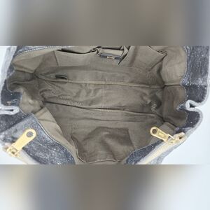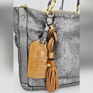 Elevate your style with this Chloe Eden Distressed Metallic Silver Calfskin Tote Bag. Crafted with attention to detail, it offers both elegance and functionality. This beautiful bag features distinctive distressed leather, three interior slip pockets, two interior side zip pockets, double top handles, a detachable tan leather logo luggage tag, and a matching tan leather tassel charm. The "Chloé" logo is subtly embossed repeatedly on the edges of the bag.
