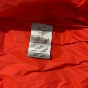 Vibrant red puffer jacket with a hood. Features zippered pockets.