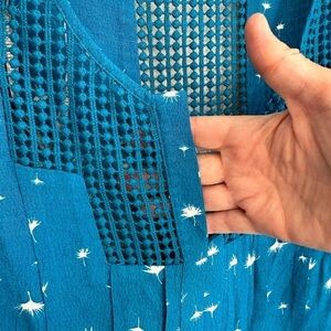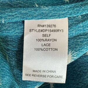 **Stock photos used to show style and fit of top. Blouse for sale is blue with white flowers. Top is a bluish teal color and is best depicted in last four photos**