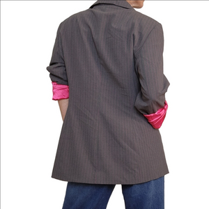 Stylish gray blazer featuring a vibrant pink lining