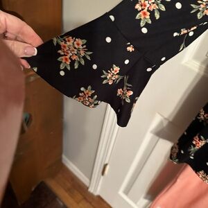 This chic skirt set features a floral black top paired with a stylish peach skirt. Perfect for adding a touch of elegance to your wardrobe. Top is baby doll style