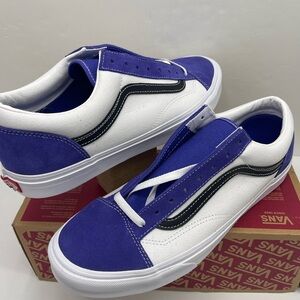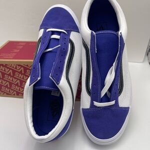 Classic Vans sneakers with a bold white and blue look. Comfortable and stylish for any occasion.