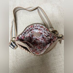 Stylish tan crossbody bag with a woven strap. Perfect for everyday use. Good preowned condition some minor signs of wear