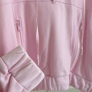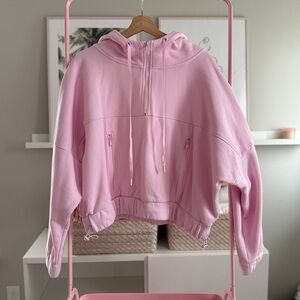 A super soft and cozy POFLEX cropped hoodie in the prettiest soft pink. Designed with an elevated athleisure feel, this piece features a flattering cropped silhouette, half-zip neckline, adjustable cinched hem, and zippered front pockets for both style and function. Perfect for everyday wear, lounging, errands, or layering with your favorite denim or leggings.