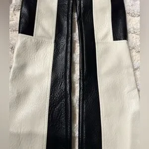 Features: Pebbled faux leather fabrication, zip-fly with hook-closure, pocketless design, colorblock detail
