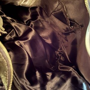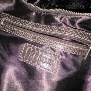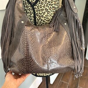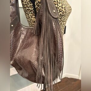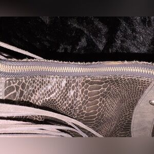 Chic hobo bag with snakeskin, faux suede like texture. Features fringe accents. Ideal for stylish outings. Inside of bag is clean, no stains, includes pocket for phone and a good size to carry a wallet, sunglasses, and makeup bag. Working zippers includes inside pocket and zipper to bag. Gently loved, no flaws. Smoke free, pet free home.