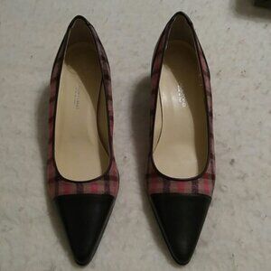 Textured plaid fabric with leather pointy toes and leather heels.