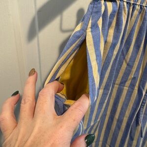 Chic nautical skirt with blue and yellow stripes. Ideal for everyday wear or on the beach! Cotton rayon material but has a linen feel to it. Great condition. Universal Thread size small. Side slit and elastic waist with drawstring. Midi to maxi length depending on height.