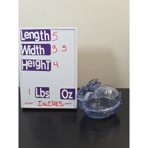 The L.E. Smith Glass Bunny Candy Dish is a small, oval-shaped dish made of etched glass, featuring a blue rabbit design on a nest basket. Manufactured in 1982, this glossy-finished piece is a part of the Animals collection and is suitable for any room in the house. Packaged in a box, this covered trinket dish is a licensed reproduction from the late 20th century, making it a charming addition to any Easter or holiday decor.