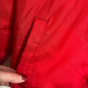 Keywords: vintage bomber jacket, vintage varsity jacket, satin bomber jacket, cheer jacket, cheerleading jacket, school spirit jacket, red varsity jacket, 70s 80s bomber, made in USA jacket, vintage nylon jacket, retro athletic jacket, Americana vintage, novelty varsity jacket, embroidered bomber