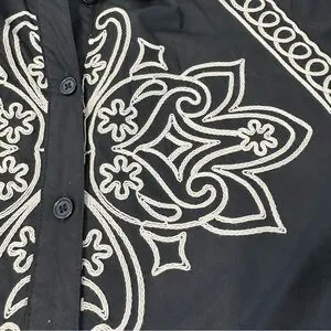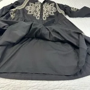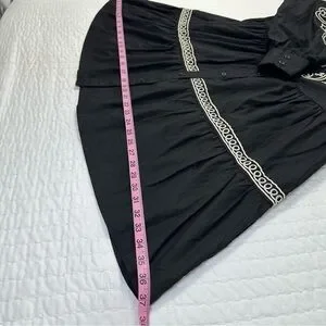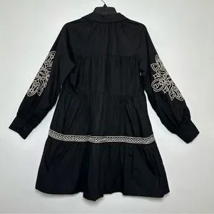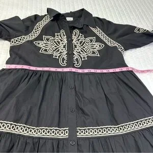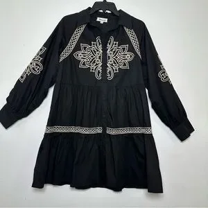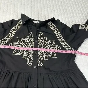 Discover elegance with this stunning black dress featuring intricate cream embroidery. Perfect for any occasion, its long sleeves add a sophisticated touch. Channel your free spirit and make this embroidered button down dress your go-to look this season! Woven fabric, with darling embroidery throughout, shapes this boho-chic dress that has a collared neckline, button down placket, and long puff sleeves with buttoned cuffs. Embroidery on the sleeves, bodice, and skirt seam complete the look.