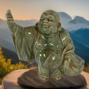Happy Buddha Pointing Right Green Rare Hotei Smiling Wealth Prosperity Vintage