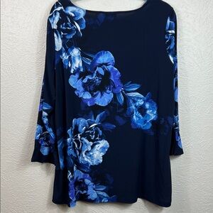 Susan Graver navy blue floral 3/4 sleeve top, size XL. 96% polyester, 4% spandex with a scoop neckline and a split detail on the sleeves in a floral print in blue, purple and white, so pretty!