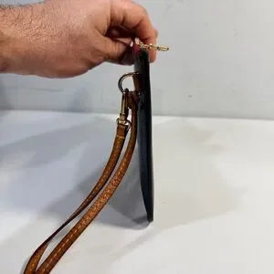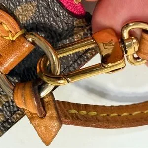 Elegant Louis Vuitton wristlet with iconic monogram pattern. Features a brown and tan design with a pink interior.