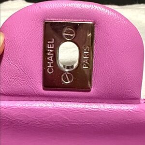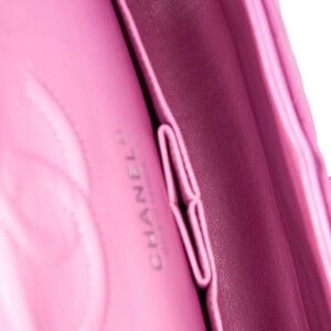 Authentic Chanel medium classic timeless double flap in pink purple tone lambskin leather & silver hardware. Features classic quilted design and silver-tone chain strap.