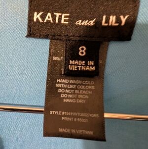 Beautiful and Feminine Dress by Kate and Lily. Size 8. Lined. Polyester Spandex blend. Good pre-owned condition. Has a nice flare, see video. Pit to pit measurement is 17 inches. Waist is 25 with a little stretch. Length is 44 inches. Lightweight. Dd21