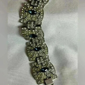 From my Collection, beautiful Circa 1930's bracelet.Made from pot metal with glamorous and sparkling pave rhinestone design, accented by blue marquise stones. Measures 1" wide x 7.25" long with closed. Closure is secure and tight.great workmanship and quality, over 100 years old and still in unbelievable condition.!!