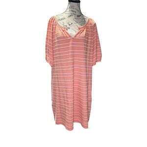 Breezy coral and white striped dress with pockets. Features a round neckline and soft fabric.
