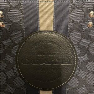 Stylish Coach tote with signature pattern. Navy and black design. Perfect for any occasion.