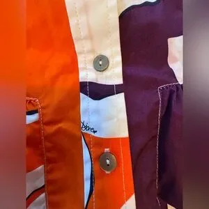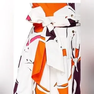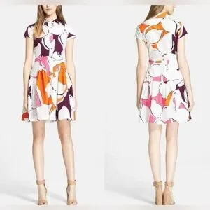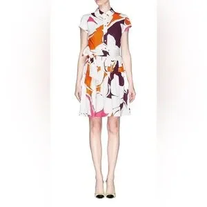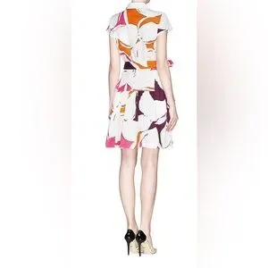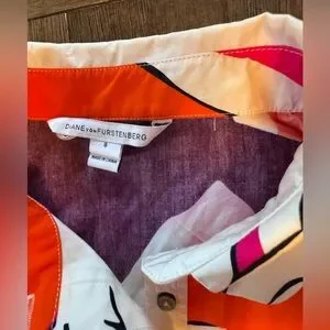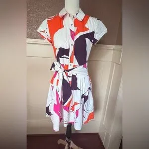 This is a Diane von Furstenberg "Scarlet" floral print cotton shirtdress in a multi-color pattern. Size 8 Chic mini dress with bold floral design. Features purple, orange, and pink hues. Ideal for stylish outings.