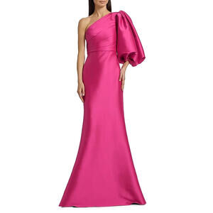 This stunner’s standout feature is its one-shoulder design, complete with a sculptural, oversized puff sleeve. The beautifully pleated bodice brings texture and intrigue as it flows into the floor-length mermaid skirt for a look that’s all about elegance in motion. Crafted entirely from stretch Mikado fabric, this dress boasts a silky, light-catching sheen and just the right amount of structure, giving you a flawless fit that moves effortlessly with you.